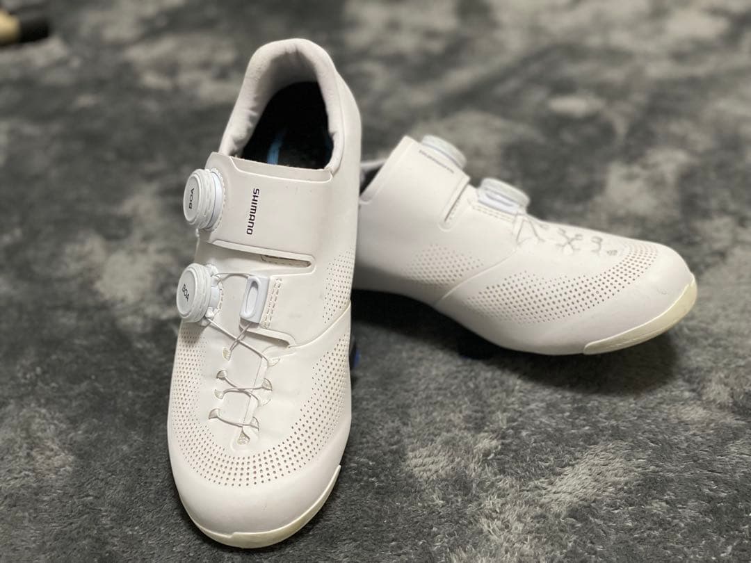 オークションサイトで購入しましたが、使う事が無くなったので出品いたします。新品/未使用では無かったので、気になさる方の購入はお控え下さい。比較的綺麗だとは思います、(素人判断)です。 写真に載せる物が全てになります。 【スペック】●ソールタイプ:MTB COMPETITION SOLE●アッパー素材:合成皮革●たわみ量:2.5mm●レギュラーサイズより4mm足囲が広く、幅広・甲高で踵の大きい方向け